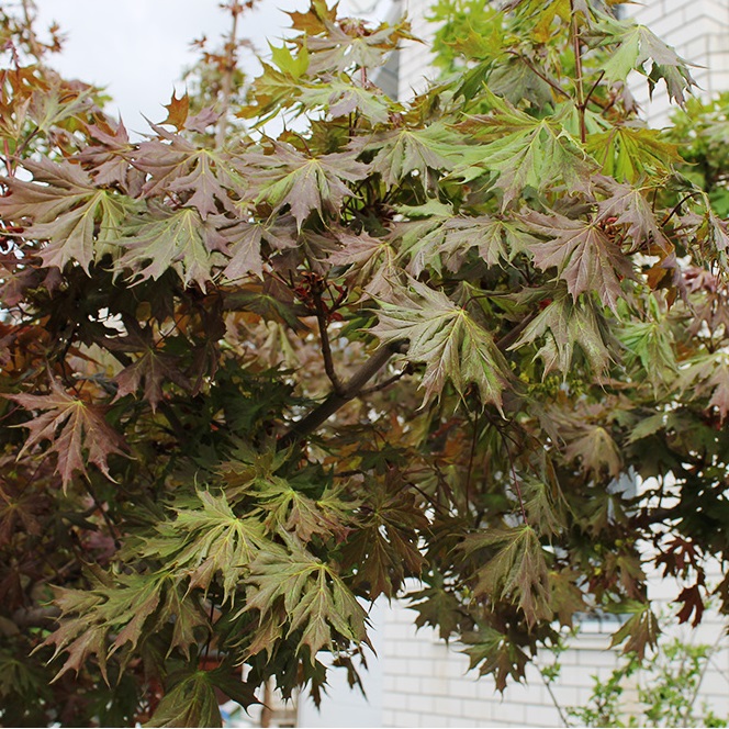 Клен остролистный Чарльз Джоли очень оригинален и декоративен! Это низкорослый клен, ветви которого стремятся к горизонтальному росту. Лист очень резной и как бы гофрированный. Внешне приближен к клену веерному, но с более мощными ветвями. При распускании листья бордовые, летом темно-зеленые, осенью желто-оранжевые.