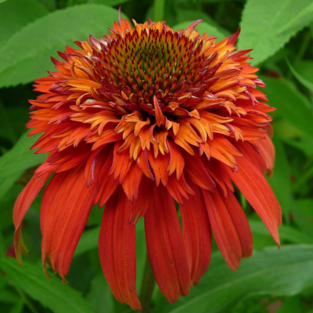 Эхинацея пурпурная Хот Папайя (Hot Papaya) представляет первый сорт растения с махровыми цветками! Бутоны, диаметром до 9 сантиметров, увенчаны пышным помпоном оранжево-красного оттенка. Нижние лепестки, словно длинные язычки, опущены вниз, образую юбочку вокруг бутона. Эхинацея распускается в июне и продолжает цветение до сентября. Сорт прекрасно стоит в срезке. Цветущая эхинацея распространяет по саду приятный аромат. Высота растения достигает 1 метра. Многолетник зимостоек и неприхотлив. Эхинацея пурпурная Хот Папайя любит солнечные участки для посадки.
