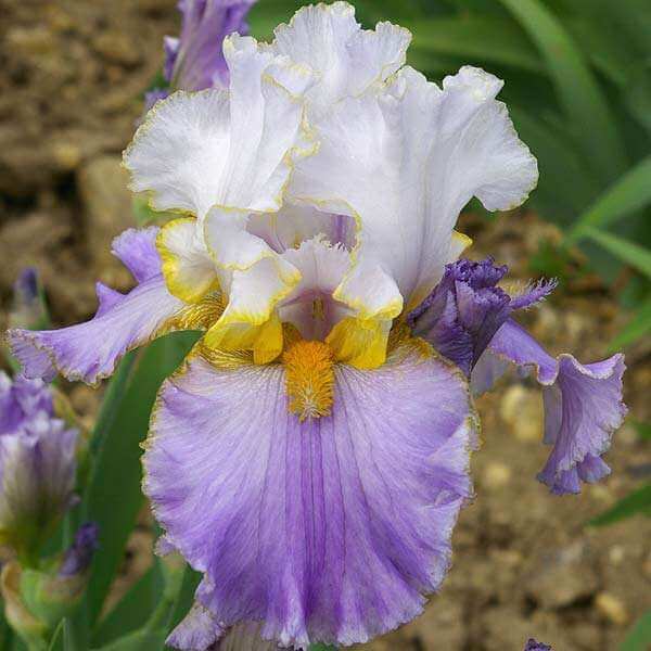 Ирис Fundamental - ирис с сильным запахом пряностей. Белые стандарты с лиловыми оттенками по центру лепестков переходят в светло фиолетовые фолы украшенной ярко желтой бородкой. Красивая форма и заметные кружева на стандартах. Высота цветоноса 91 см.