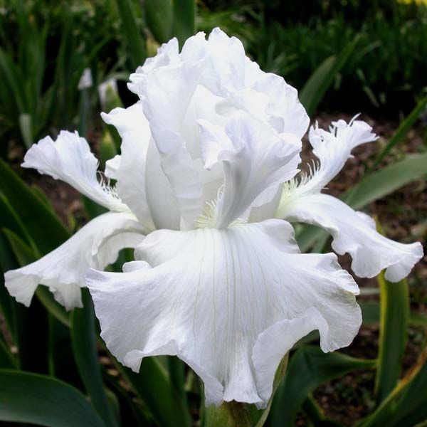 Рассада ириса Mesmerizer - высокий бородатый ирис кристально белого цвета. Верхние и нижние доли (стандарты и фолы) окрашены в чистый белый цвет. Нежные лепестки по краю оформлены гофрированием и кружевными оборками. На белом фоне резко выделяется нежно-мандариновая бородка. Основное отличие сорта состоит в наличии дополнительных маленьких лепестков, которые образуются на концах бородок. Цветок обладает приятным ароматом. Сроки цветения – средние. Цветение обильное, благодаря тому, что растение хорошо кустится и формирует декоративный цветущий куст.