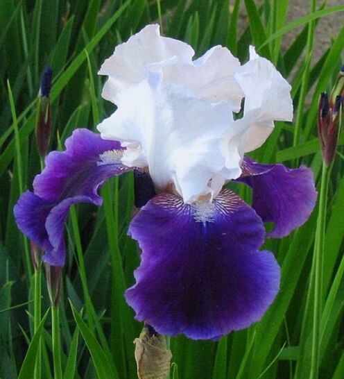 Snow Mound обладает белыми стандартами. Фолы темно-фиолетово-синие с тонкой белой каймой, бархатистый Бородка лимонно-белая.