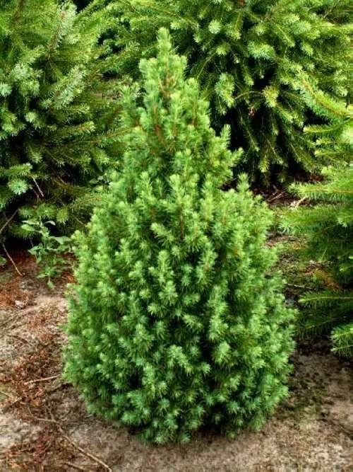 Ель канадская Conica - карликовая конусовидная форма. Высота 3-4 м, диаметр кроны 2 м. Годовой прирост в высоту 6-10 см, в ширину 3-5 см. В 35 лет высота 3,6 м у некоторых экземпляров. Самое старое растение в возрасте 60 лет имеет высоту 4 м. Крона густая. Хвоя мягкая, светло-зеленая. Сорт используется при одиночных посадках, в группах, альпинариях. Ель канадская Коника декоративна благодаря правильной, конической форме кроны.
