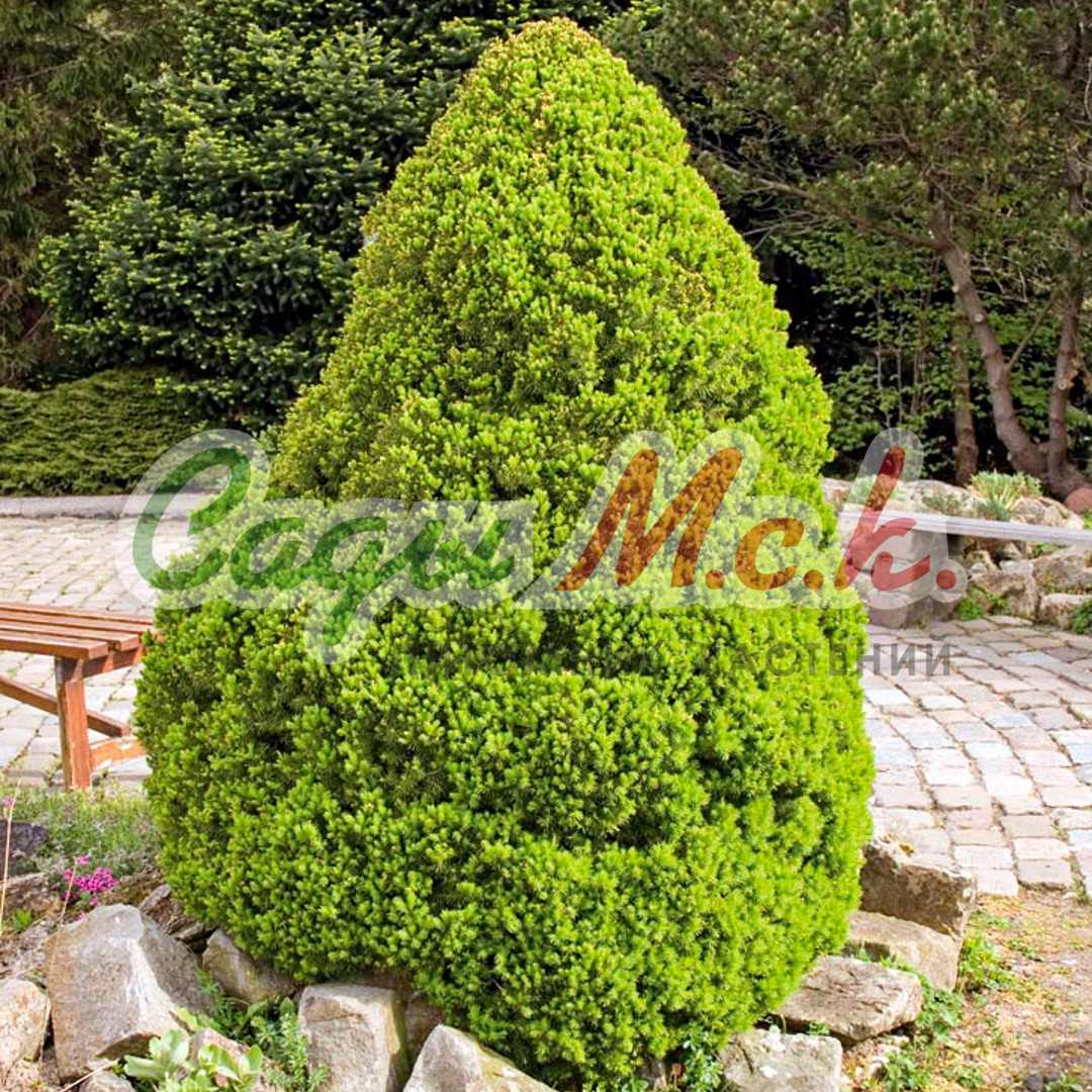 Карликовая конусовидная форма ели. Достигает высоты 2 м, диаметра кроны 1 м. Хвоя игольчатая, радиальная, редко расположенная, 10 мм длиной, очень мягкая, светло-зеленая. Растет на свежих или влажных, умеренно богатых питательными веществами почвах, от кислых до щелочных. Светолюбива, выносит полутень. Особенности: Ель канадская Коника Спиди декоративна благодаря правильной, конической форме кроны. Плохо переносит уплотнение и переувлажнение почвы. Морозостойка. Одно из лучших и популярнейших растений для каменистой горки, используется для выращивания в контейнерах на крышах и террасах, для одиночных и групповых посадок, альпинариях. Высота саженца 30-40 см.