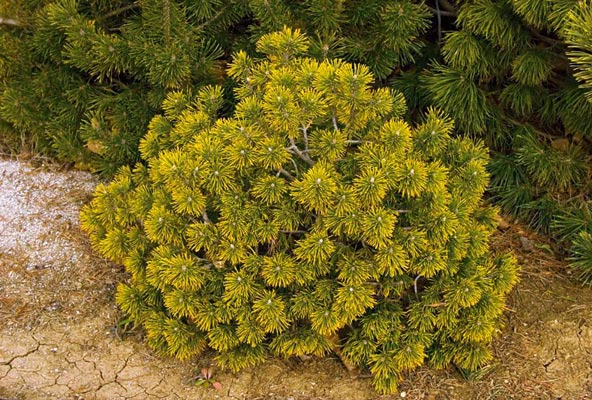 Сосна горная Carstens Wintergold - карликовый хвойный кустарник с плотной, шаровидной, компактной кроной и декоративной хвоей. Растет очень медленно (6-7 см в год), достигает 0,7 метра в высоту и 1,2 м в диаметре. Хвоя короткая, жесткая, блестящая. Летом хвоя темно-зеленая, осенью желтеет и становится золотисто-желтой с медным оттенком.